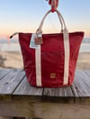 This cute little tote is approximately 10wide by 11 high and features and front pocket and a zip top closure, as well as an interior slip pocket. Perfect for taking around your goods in a stylish way!